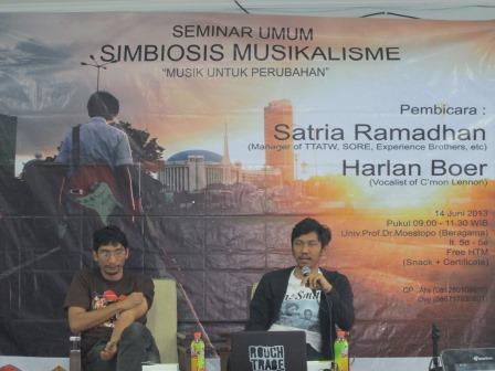Tepat pukul 09.00 acara dimulai, kedua pembicara tersebut membahas tentang perkembangan hingga perubahan musik dari band indie. “Musik menurut gue adalah pesan yang ingin disampaikan melalui nada dan irama, selain itu musik juga bahasa yang universal yang bisa dimengerti seluruh lapisan masyarakat,” ungkap Harlan Boer dalam seminar tersebut. Harlan menambahkan bahwa membuat musik bukan hanya dibutuhkan skill dan disiplin saja, melainkan butuh ekspresi dalam memainkannya. “Karena hanya orang yang cinta musik saja yang bisa menjual musik kepada penikmatnya, karena akan terlihat ‘power’ dari musik tersebut,” tambahnya.