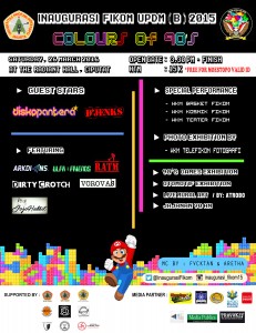 Acara persembahan dari mahasiswa baru Fikom UPDM(B) angkatan 2015 ini mengusung tema ‘THE SPIRIT OF 90’S ERA’ yang diartikan sebagai semangat positif dari pemuda tahun 90-an. Lalu dengan judul acara ‘COLOURS OF 90’S’ angkatan 2015 kali ini berharap Inaugurasi Fikom 2015 akan menjadi tempat berkumpulnya keluarga besar FIKOM UPDM(B) di umur yang ke-51 tahun.