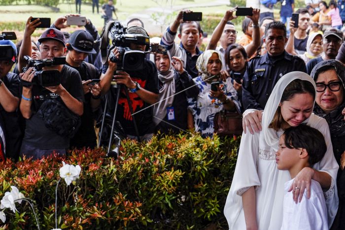 Kesedihan Bunga Citra Lestari bersama sang anak, Noah Sinclair saat prosesi pemakaman Ashraf Sinclair di San Diego Hills Memorial Park, Karawang, Jawa Barat, Selasa (18/2). (Foto: ANTARA FOTO)