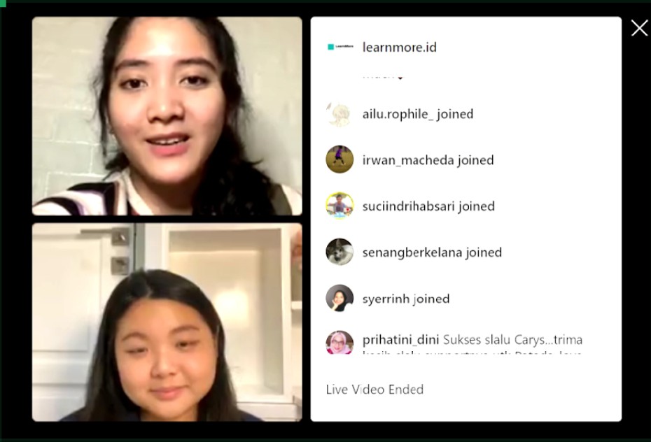 Suasana live learning yang dilakukan di akun Instagram @learnmore.id dengan Carys Mihardja sebagai pembicara, Sabtu (27/3). (Foto: Dokumentasi LearnMore Online Class)