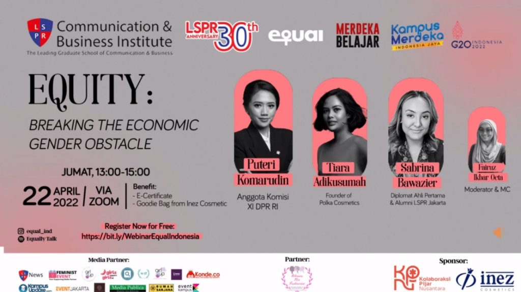 Jakarta, Media Publica – Equal Indonesia sukses menyelenggarakan webinar dengan tema “Equity: Breaking the Economic Gender Obstacles” pada Jumat (22/4) di aplikasi Zoom Meeting. Webinar yang dihadiri 132 peserta ini adalah upaya Equal Indonesia dalam memberikan akses informasi juga edukasi kepada masyarakat umum, khususnya generasi Millenial dan generasi Z akan peran penting perempuan dalam sektor ekonomi. Dalam acara ini, Equal juga menyinggung terkait masalah kesenjangan gender yang masih sering ditemui pada sektor tersebut.