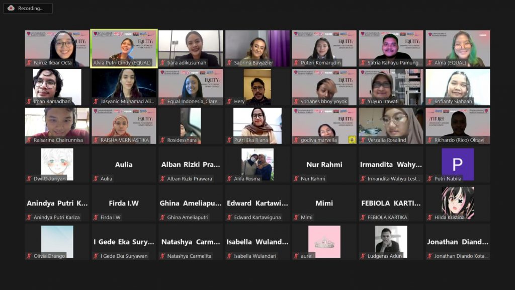 Equal Indonesia menyelenggarakan Webinar bertajuk “Equity: Breaking the Economic Gender Obstacle” pada (22/4) melalui aplikasi Zoom Meeting. Acara dilaksanakan sebagai upaya memberikan informasi edukatif mengenai peran penting perempuan di industri ekonomi serta bisa menyikapi masalah ketimpangan gender yang dialami perempuan dalam industri tersebut. (Foto: Equal Indonesia)