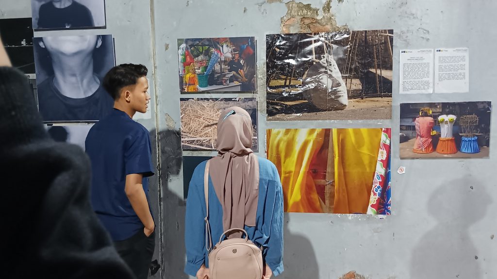 Salah satu pameris (kiri) Pameran Foto Akbar 2023 “Ragam Kisah” WKM Telefikom Fotografi menjelaskan hasil karya fotografinya kepada pengunjung (kanan) Selasa (1/8) (Foto: Media Publica/Nur Sifa)